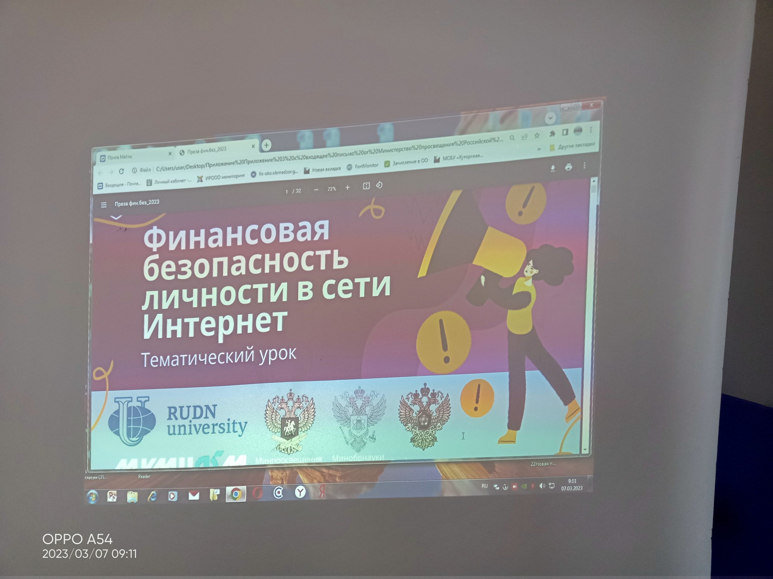 7 2023 года марта в МОБУ «Хуторская сош» пррошел Всероссийский тематический урок «Финансовая безопасность». Обучающиеся узнали о видах финансового мошеничества, о том как отличить финансовую пирамиду от банка. Познакомились с понятиями «вкладчик», «кредитор», «заемщик». Узнали кто такие инвесторы и акционеры. Познакомились с понятием инфляции и ее причинами. Было рассказано о том, как не стать жертвой мошенников в интернете, как не попасть на фишинговые сайты и не потерять деньги. В общем урок прошел положительно и интересно, принесший ребятам много новых знаний.